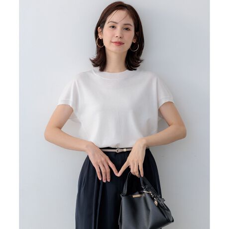 ■デザイン・Tシャツ感覚で着用できるニットTは、リラクシーなシルエットでボリュームのバランスを後ろにつけることで、気になる二の腕や背中をさり気なくカバーしてくれます。・タックアウトでもバランスがとりやすく合わせるボトムを選ばない万能トップスです。・ボディラインをひろいすぎないシルエットで適度なリラックス感がありながら、絶妙な襟元ですっきりとしたバランスに仕上げました。・スリーブの位置を立体的にすることで生まれるやわらかな脇のラインとふんわりとしたフォルムが女性らしさを後押ししてくれます。