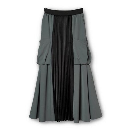 プリーツ切替が揺れを生み、抑えたフレアと落ち感で甘さを削いだ仕上がりに。
