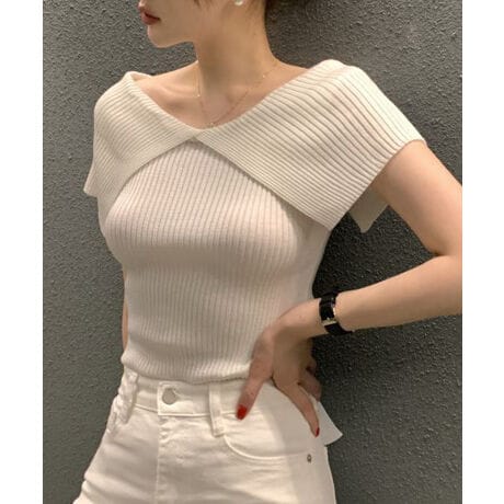 女性らしさ満点のビッグカラーリブニットトップス。