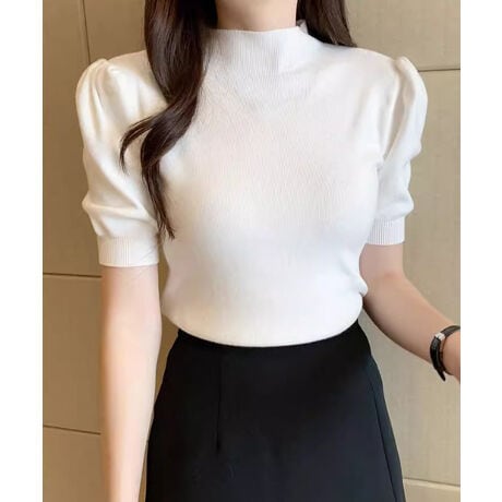 上品見えと体型カバーを両立するパフスリーブニットトップス。