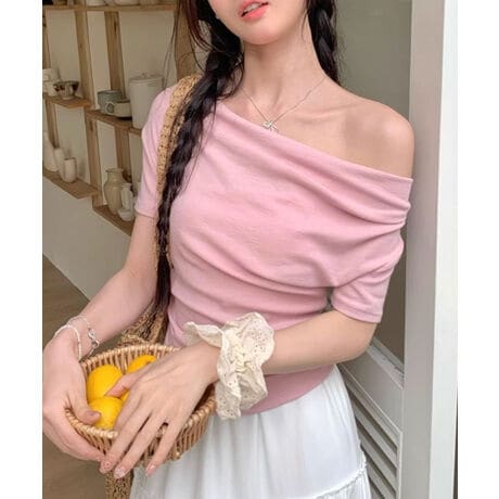 首元に自然な落ち感を持たせたドレープデザインで、鎖骨ラインをきれいに演出。オフショル風にも着用でき、抜け感のある印象に。