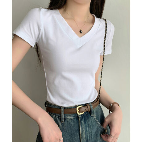 シンプルで着まわしやすい無地のVネックTシャツ。