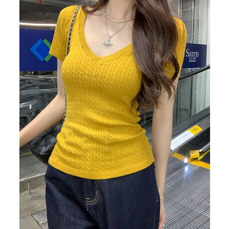 フィット感で魅せる、Vネックケーブル編み半袖ニットトップス。