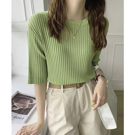 【7色】ベーシックリブ五分袖ニット