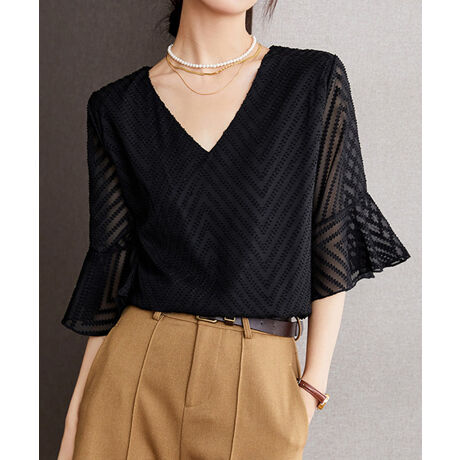 涼しげ×上品。表情のあるシアー感で大人の抜け感を演出するVネックブラウス。