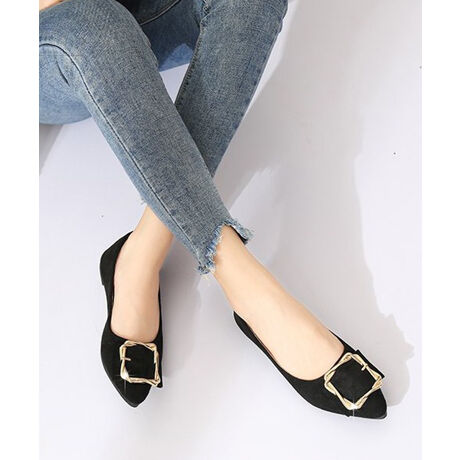 スエード調の上品な質感が魅力の、スクエアバックルフラットパンプス。