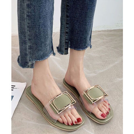 足元に上品なアクセントを添える、スクエアバックルフラットサンダル。