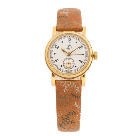 しっとりとした手触りのホーウィン(HORWEEN)レザーに、シックなカラートーンのボタニカル柄をプリントしたアンティーク調腕時計。