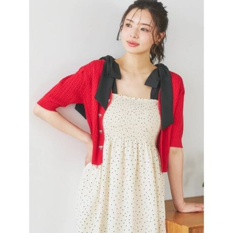 [型番:26550729907]表情のあるケーブル編みが魅力のニットカーディガン。フロントにあしらったリボンボタンが、さりげないアクセントを添えます。コンパクトな丈感で、ワンピースやハイウエストボトムともバランスよく合わせやすい一枚です。モデル(赤着用)身長:165cmMサイズ着用