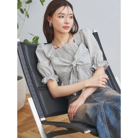 [型番:26560781866]フロントのリボンデザインが目を惹くシャーリングブラウス。立体感のあるシャーリングが程よくフィットし、女性らしいシルエットに仕上げています。ふんわりとしたスリーブとコンパクトな丈感で、バランスの取りやすいデザイン。デニムでカジュアルにも、スカートでフェミニンにも着こなせる一枚です。モデル(A柄/B柄着用)身長:165cmMサイズ着用