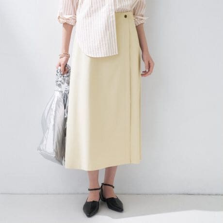 フロントの巻きスカートのようなデザインが、シンプルながらも洗練された大人の表情を作り出します。