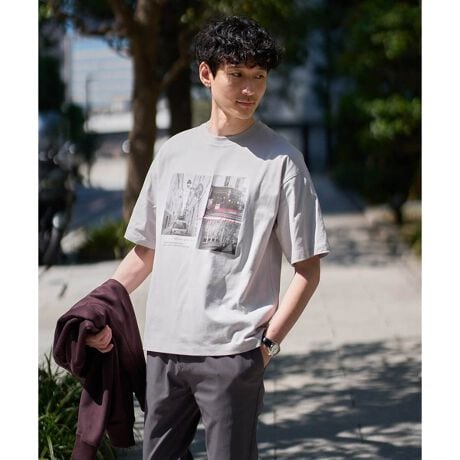 ヨーロッパの日常風景の写真をコラージュしたフォトプリントとロゴプリントを施したカットソー。