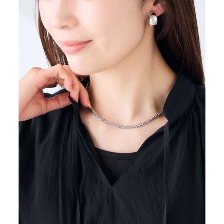 存在感のあるチェーンが首元に自然な輝きを添え、上品で洗練された印象に。