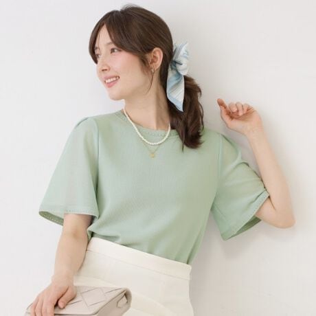 お袖にシアー感のある同色生地をドッキングしたニット。