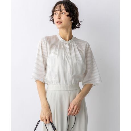 さらっとした質感と、ほんのりとした透け感が涼しげなストライプ柄のバンドカラーブラウスです。フロントに施されたタックデザインが縦のラインを強調し、着用するだけですっきりとしたシャープな印象を与えます。首元のボタンを留めてきちんと感のあるバンドカラーとしてはもちろん、ボタンを外してスキッパー襟のように着用できる仕様も魅力。デコルテをきれいに見せ、程よい抜け感を演出します。ゆとりのあるシルエットでボディラインを拾いにくく、気になる部分を自然にカバーしてくれるのも嬉しいポイントです。すっきりとしたテーパードパンツと合わせてオフィススタイルに、またジャケットのインナーとして合わせてももたつかず、スマートに決まります。カラーは、清涼感あふれるホワイト(#101)と、知的で落ち着いた印象のネイビー(#175)の2色展開です。
