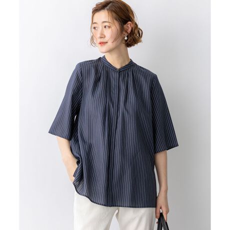 さらっとした質感と、ほんのりとした透け感が涼しげなストライプ柄のバンドカラーブラウスです。フロントに施されたタックデザインが縦のラインを強調し、着用するだけですっきりとしたシャープな印象を与えます。首元のボタンを留めてきちんと感のあるバンドカラーとしてはもちろん、ボタンを外してスキッパー襟のように着用できる仕様も魅力。デコルテをきれいに見せ、程よい抜け感を演出します。ゆとりのあるシルエットでボディラインを拾いにくく、気になる部分を自然にカバーしてくれるのも嬉しいポイントです。すっきりとしたテーパードパンツと合わせてオフィススタイルに、またジャケットのインナーとして合わせてももたつかず、スマートに決まります。カラーは、清涼感あふれるホワイト(#101)と、知的で落ち着いた印象のネイビー(#175)の2色展開です。