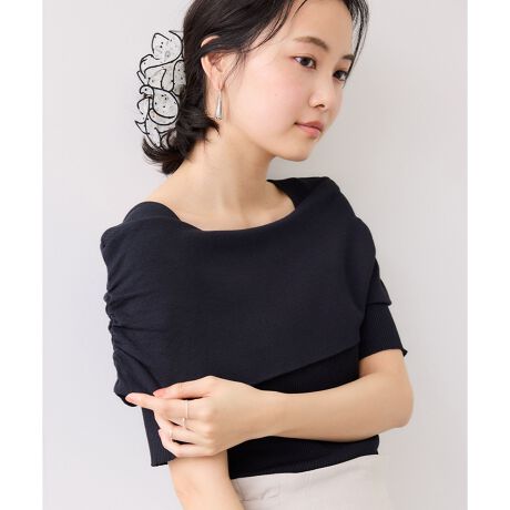 オフショルダーの衿両サイドにギャザーを入れて、女らしく仕上げた半袖ニットです。