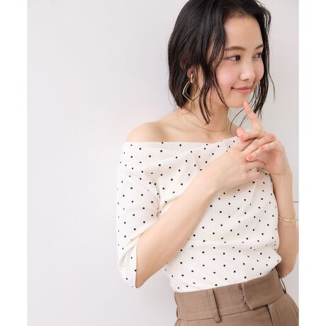 胸周りにタックをいれ、流れるドレープデザインは、身に纏うだけで立体的な美しさを生み出し、洗練された上品な佇まいを演出。リブ素材を使用しているので、着心地の良さとスッキリ感もあります。トップスはボトムアウトでサッと着こなしでも、裾にメタルパーツのポイントがありおすすめです。