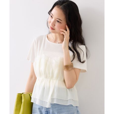 フォルムとツヤ感のあるビスチェ素材で華やかさをプラスするビスチェコンビプルオーバー。程よく広がったネックラインは暑い時期にフェミニンな首回りを演出します。