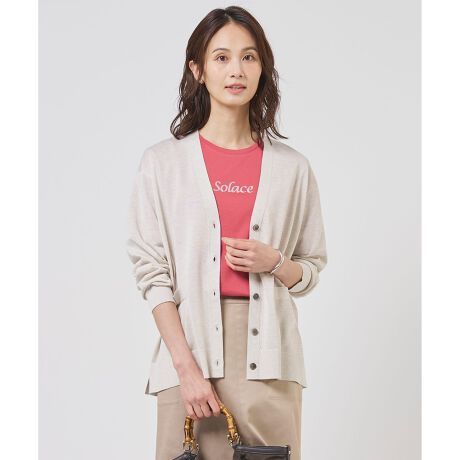 ■デザイン繊細な光沢感が上品なニットカーディガン。インナーを選ばないベーシックなデザインで、ブラウスやカットソーの上にさっと羽織るだけで洗練された雰囲気を演出します。レイヤードスタイルはもちろん、肩掛けしてコーディネートのアクセントにするなど、着こなしの幅が広がります。オフィスや休日のカジュアルシーンまで、あらゆる場面で活躍する頼れるアイテムです。カラーは、やわらかく肌なじみの良いナチュラル(#002)、落ち着いた印象のライトグレー(#003)、こなれ感のあるダークブラウン(#035)、爽やかなグレイッシュブルー(#072)の4色展開です。