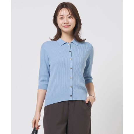 ■デザインリブベースで編み立てた、クラシカルなポロニットカーディガン。縦のラインを強調したリブ編みがすっきりとした印象の1着です。程よいゆとりを持たせたシルエットで、体のラインを拾いすぎないのが嬉しいポイントです。釦を閉じてプルオーバーとして着ればきちんと感のある装いに、前を開けてカーディガンとして羽織ればリラックスした雰囲気に、着回しの効くアイテムです。パンツにもスカートにも合わせやすい丈感で、清涼感あふれる春夏の装いを楽しめます。カラーは、華やかな存在感のあるルビーレッド(#010)、ナチュラルで温かみのあるモカ(#030)、爽やかで知的な印象のサックスブルー(#073)、シーンレスに活躍するネイビー(#075)の4色展開です。