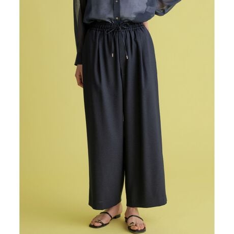 ■デザイン・ウエストゴム仕立てで前のドロストがポイントのイージーパンツです。・程よいワイドストレートシルエットでトレンドのリラックス感があります。・後ポケットに組曲オリジナルロゴ刺繍入りでこだわりの詰まった商品です。・裏無し仕立て。・同素材のジャケットと合わせてセットアップとしても、単品としても活躍してくれるアイテムです。