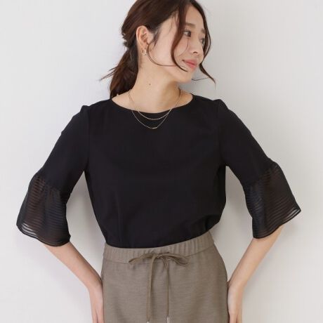 袖口に涼しげなシアーボーダーを組み合わせた異素材ドッキングのトップス。