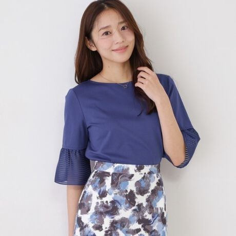 袖口に涼しげなシアーボーダーを組み合わせた異素材ドッキングのトップス。