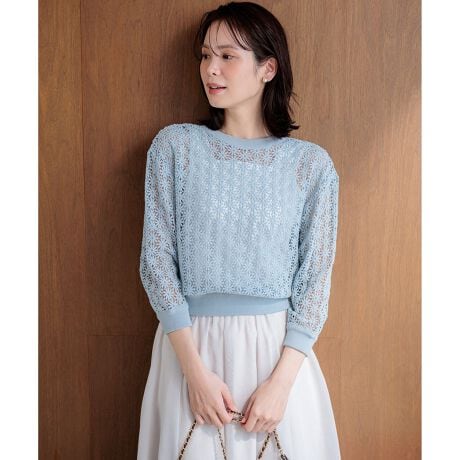 ■デザイン・オリジナルレースを全面にあしらったカーディガンは、端正な襟元とコンパクトなクロップド丈がシックでモダンな印象に。・首や肩が美しく見える絶妙なルーズフィットなサイズ感にこだわりました。・前後着用ができ、プルオーバーとしての完成度の高さも魅力です。・絶妙な分量感で背中のお肉や、腕の気になる部分をカバーしてくれるシルエットも嬉しいポイントです。・袖をたくし上げた時のボリューム感にもこだわりました。・スタイルアップして見えるようなシルエットを追求し、ウエストのリブを工夫することでウエスト位置を高く見せ、メリハリのあるラインを実現。・横から見ても曲線的で女性らしい柔らかな印象にしています。・気どらない女性らしさを演出し、シンプル以上の着こなしにしてくれます。