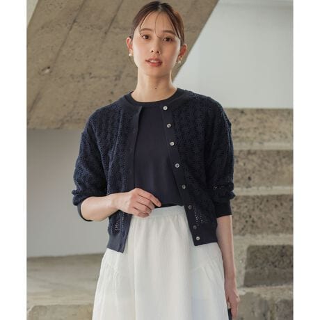 ■デザイン・オリジナルレースを全面にあしらったカーディガンは、端正な襟元とコンパクトなクロップド丈がシックでモダンな印象に。・首や肩が美しく見える絶妙なルーズフィットなサイズ感にこだわりました。・前後着用ができ、プルオーバーとしての完成度の高さも魅力です。・絶妙な分量感で背中のお肉や、腕の気になる部分をカバーしてくれるシルエットも嬉しいポイントです。・袖をたくし上げた時のボリューム感にもこだわりました。・スタイルアップして見えるようなシルエットを追求し、ウエストのリブを工夫することでウエスト位置を高く見せ、メリハリのあるラインを実現。・横から見ても曲線的で女性らしい柔らかな印象にしています。・気どらない女性らしさを演出し、シンプル以上の着こなしにしてくれます。