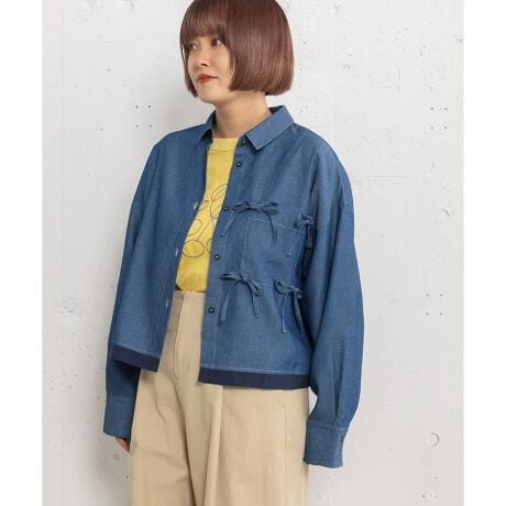 ポケットにたくさんついたリボンデザインが遊び心あるシャツ。かっちりしたシャツを、ゆるっとしたサイズ感とクロップド丈で今っぽくアレンジしました。裾は無地を切り替えたダブルヘムのデザイン。甘さときちんと感をバランスよく楽しめるシャツです。フルオープンで羽織としての着用もこなれた印象になるのでおすすめです。