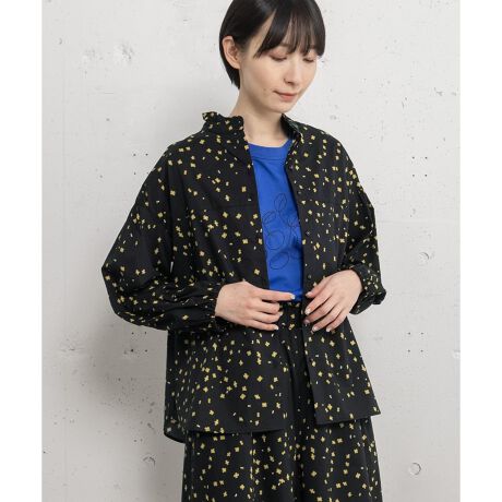 花柄とドットを散りばめたオリジナルのテキスタイルで仕立てた、スタンドフリルカラーのブラウス。身体のラインを拾わないサイズ感と、ヒップにかかる丈感で安心感があります。ボリューム感のある袖はゴム仕様でまくりやすく、こなれた印象に。インでもアウトでもスタイルがサマになり、羽織りとしても着られてロングシーズン着用可能なアイテムです。