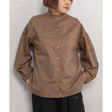 花柄とドットを散りばめたオリジナルのテキスタイルで仕立てた、スタンドフリルカラーのブラウス。身体のラインを拾わないサイズ感と、ヒップにかかる丈感で安心感があります。ボリューム感のある袖はゴム仕様でまくりやすく、こなれた印象に。インでもアウトでもスタイルがサマになり、羽織りとしても着られてロングシーズン着用可能なアイテムです。