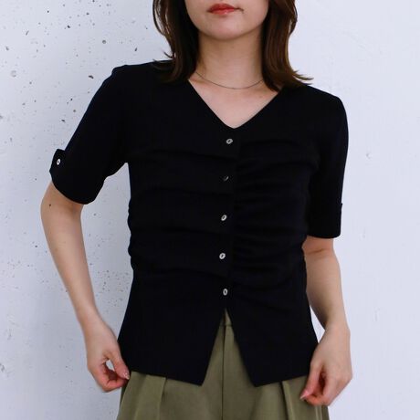 ■デザインで着映えする、ハーフスリーブタックボタンニットプルオーバー■