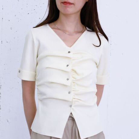 ■デザインで着映えする、ハーフスリーブタックボタンニットプルオーバー■