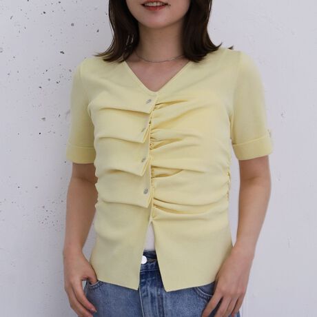 ■デザインで着映えする、ハーフスリーブタックボタンニットプルオーバー■