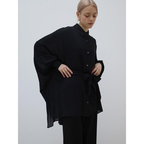 ゆったりと広めのドルマン型に、ウエストリボンのボリュームが存在感を与えるシャツ。付属のリボンをウエストに付けることでメリハリのあるシルエットにアレンジが可能。パンツに合わせればモードな雰囲気に、スカートに合わせればフェミニンな雰囲気に。一枚でコーデの幅が広がる万能なアイテムです。