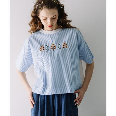 フロントの刺繍が目を惹くデザインTシャツ。丸と四角を組み合わせたノルディックテイストの刺繍です。前身頃と袖は布帛の柄生地を使用し、後ろ身頃はカットソー素材を組み合わせています。リラックスできる着心地ながら、カジュアルすぎずにブラウスのように着ていただけるアイテムです。パンツでもスカートでも合わせやすいジャスト丈。