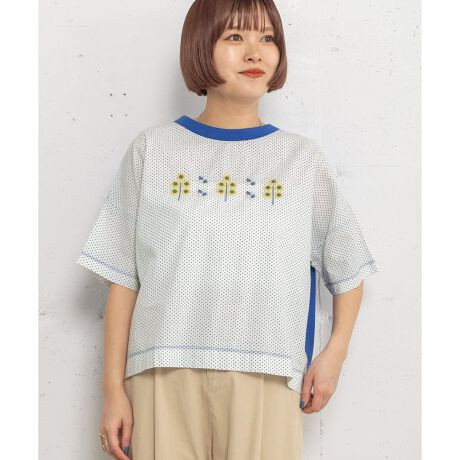 フロントの刺繍が目を惹くデザインTシャツ。丸と四角を組み合わせたノルディックテイストの刺繍です。前身頃と袖は布帛の柄生地を使用し、後ろ身頃はカットソー素材を組み合わせています。リラックスできる着心地ながら、カジュアルすぎずにブラウスのように着ていただけるアイテムです。パンツでもスカートでも合わせやすいジャスト丈。