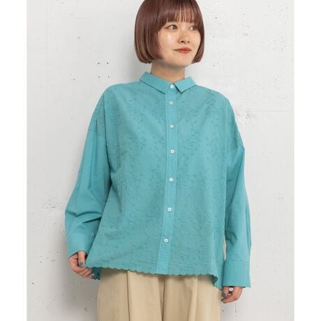 フロント、裾のスカラップ刺繍がポイントのブラウス。レギュラーカラーできちんと感もあります。肌あたりの優しいコットン素材で通年着ていただけます。ジャケットなどの下に重ねて裾をちら見せさせたり、フルオープンで羽織りとしても着用して頂けます。