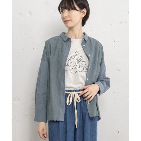 フロント、裾のスカラップ刺繍がポイントのブラウス。レギュラーカラーできちんと感もあります。肌あたりの優しいコットン素材で通年着ていただけます。ジャケットなどの下に重ねて裾をちら見せさせたり、フルオープンで羽織りとしても着用して頂けます。