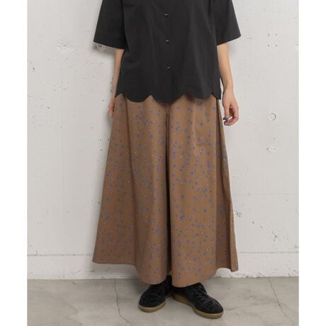 花柄とドットを散りばめたオリジナルのテキスタイルで仕立てたキュロット。ギャザーフレアのシルエットでスカート見えするデザインです。ウエストはぐるりゴムの仕様、紐でサイズ感の調節が可能です。両サイドポケットあり。