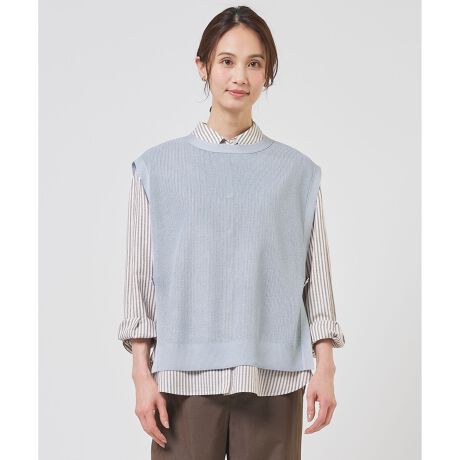 ■デザイン片畦編みで表情豊かに仕上げた、クルーネックニットベスト。 今年は脇をボタンで留めるデザインにアップデートし、よりモダンで洗練された印象に仕上げました。サイドが開いたデザインは、コーディネートに程よい抜け感とアクセントを加えます。お手持ちのシャツやワンピースと重ねるだけで、いつものスタイルを格上げしてくれる1着です。シンプルながらも存在感があり、大人の女性にふさわしい上品なカジュアルスタイルを叶えます。カラーは、やわらかく肌なじみの良いナチュラル(#002)、落ち着いた印象のライトグレー(#003)、爽やかなグレイッシュブルー(#072)、シーンレスに活躍するネイビー(#075)の4色展開です。