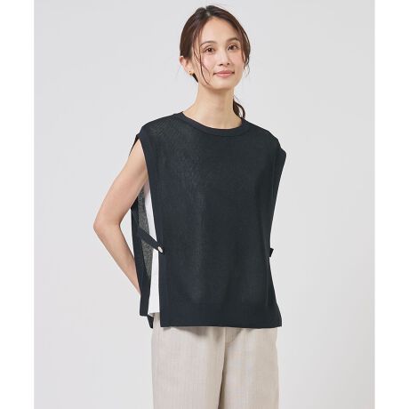 ■デザイン片畦編みで表情豊かに仕上げた、クルーネックニットベスト。 今年は脇をボタンで留めるデザインにアップデートし、よりモダンで洗練された印象に仕上げました。サイドが開いたデザインは、コーディネートに程よい抜け感とアクセントを加えます。お手持ちのシャツやワンピースと重ねるだけで、いつものスタイルを格上げしてくれる1着です。シンプルながらも存在感があり、大人の女性にふさわしい上品なカジュアルスタイルを叶えます。カラーは、やわらかく肌なじみの良いナチュラル(#002)、落ち着いた印象のライトグレー(#003)、爽やかなグレイッシュブルー(#072)、シーンレスに活躍するネイビー(#075)の4色展開です。
