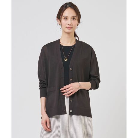 ■デザイン繊細な光沢感が上品なニットカーディガン。インナーを選ばないベーシックなデザインで、ブラウスやカットソーの上にさっと羽織るだけで洗練された雰囲気を演出します。レイヤードスタイルはもちろん、肩掛けしてコーディネートのアクセントにするなど、着こなしの幅が広がります。オフィスや休日のカジュアルシーンまで、あらゆる場面で活躍する頼れるアイテムです。カラーは、やわらかく肌なじみの良いナチュラル(#002)、落ち着いた印象のライトグレー(#003)、こなれ感のあるダークブラウン(#035)、爽やかなグレイッシュブルー(#072)の4色展開です。