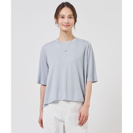 ■素材細番手のビスコースとポリエステルをブレンドした糸を使用。糸を強くねじる技術により、肌へのまとわりつきを防ぎ、さらりとした清涼感のある肌触りが特徴です。滑らかなドレープ感と繊細な光沢を持つきれいな表面感も魅力。オンにもオフにも気兼ねなくお使いいただける、汎用性の高い素材です。