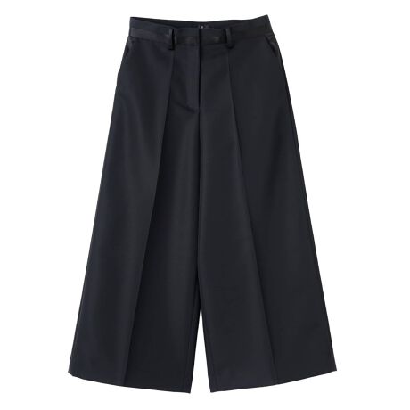 無駄を削ぎ落としたシルエットは、腰まわりから裾へ自然に落ち、凛とした佇まいを演出。同シリーズのジャケットと共通のリサイクルポリエステルサテンが、さりげない華やぎを添えます。単品でもセットアップでも映える、洗練された一本です。