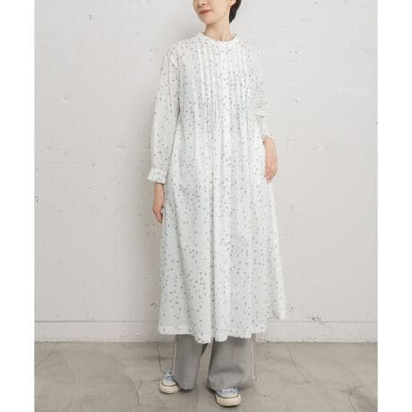 花柄とドットを散りばめたオリジナルのテキスタイルで仕立てたワンピース。フロントのタックがシンプルながらも上品なデザイン。ほどよく開いた衿元で、リラックス感のある着心地です。袖口はゴムフリルで捲りやすく、フルオープンで羽織としても使えます。ウエストの紐でフォルムの変化もお好みでアレンジしていただけます。両サイドポケットつき。