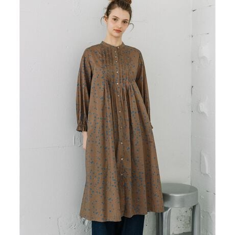 花柄とドットを散りばめたオリジナルのテキスタイルで仕立てたワンピース。フロントのタックがシンプルながらも上品なデザイン。ほどよく開いた衿元で、リラックス感のある着心地です。袖口はゴムフリルで捲りやすく、フルオープンで羽織としても使えます。ウエストの紐でフォルムの変化もお好みでアレンジしていただけます。両サイドポケットつき。