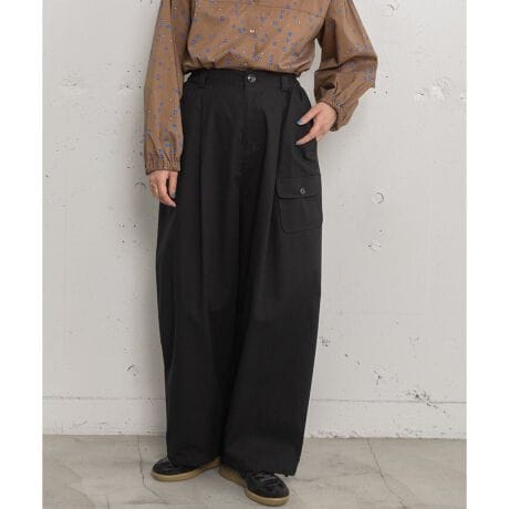 フロントのタックと脇のカーブで丸みのあるシルエットを描いたカーゴパンツ。高密度のウェザークロスとデニムで仕立てました。フラップ付きのお茶目なポケットもポイントです。裾の紐を縛るとシルエットの変化を楽しめます。ウエストは脇から後ろにかけてゴム仕様。体のラインを拾わずリラックス感のある履き心地です。両サイドポケットつき。